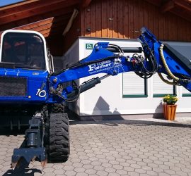Beschriftung eines Euromach R105 Schreitbaggers für Erdbau Fischer – Logo und Spinnennetz aus Reflex- und Silbermetallic-Folien: